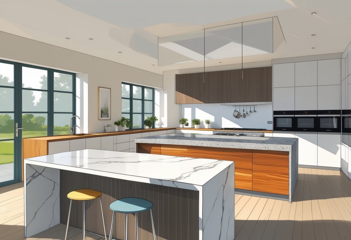 Match thickness across areas—standard 30mm or 40mm worktops keep things looking unified. You might put a statement island in one material and use something else for the perimeter, as long as the colours and styles play nicely together.